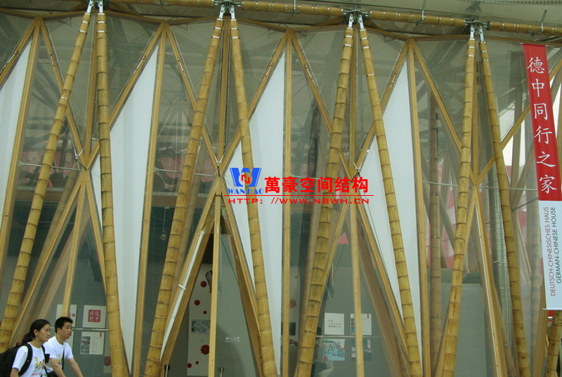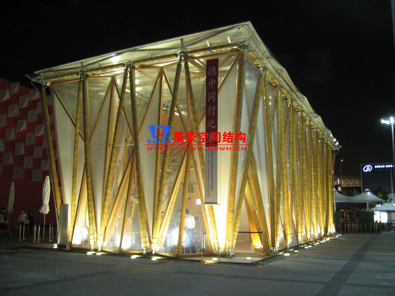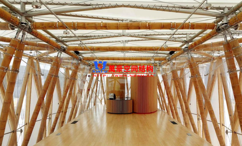 德中館展館膜結構內部樓板由膠合竹板制成的巨型梁柱體系架構,其連接構件及表面處理技藝均為此建筑量身打造。高達六米的梁柱將建筑內部進行二次分割,營造出獨立的二層樓面空間。竹桿支撐體系在建筑屋面層通過鋼節點相互連接固定。屋面面層采用PVC 膜覆蓋,墻體結構則由天然竹材和透明輕盈的新型材料ETFE膜復合構成。整個膜結構建筑體現了可持續和環保的理念,易建易拆,所有材料皆可回收或重復使用;材料來源本地化,除特殊結構件外多數產自中國本土。