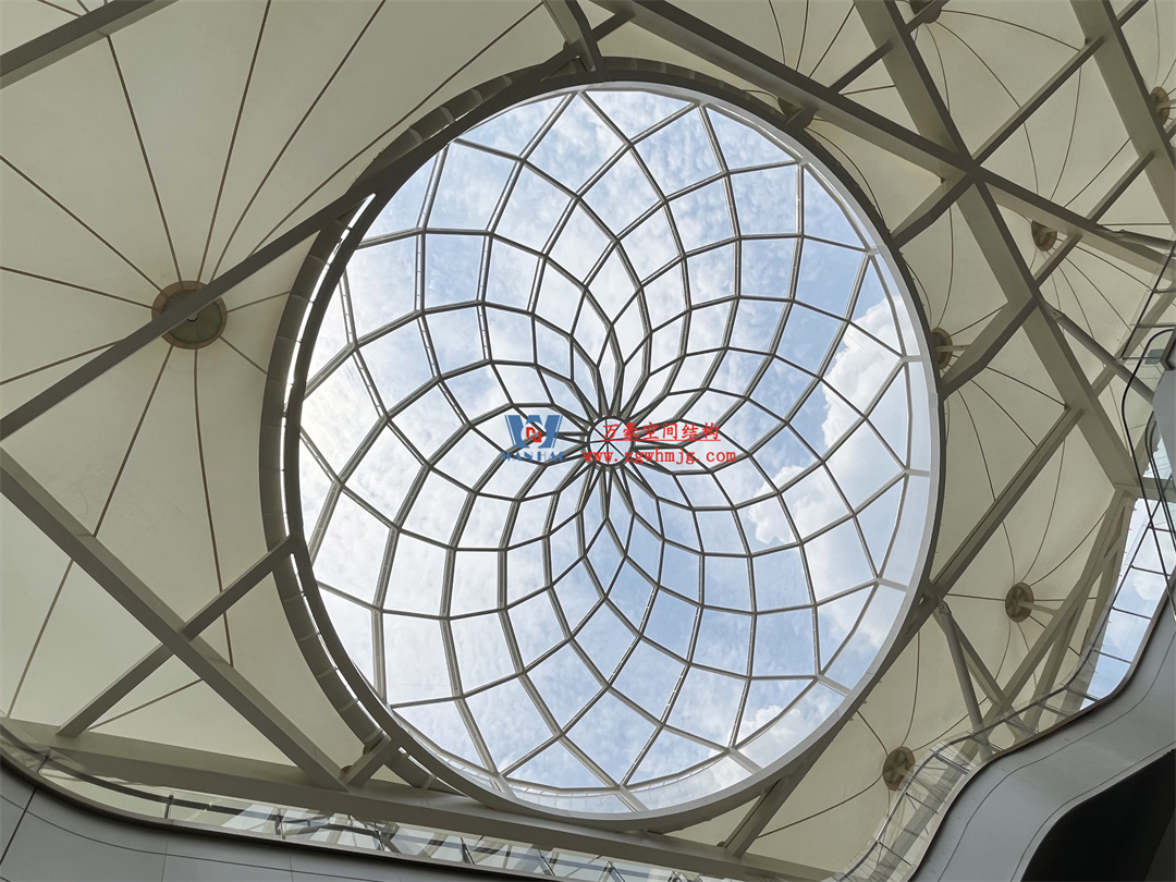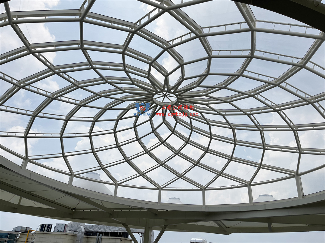 3、適應(yīng)大跨度:膜結(jié)構(gòu)材質(zhì)輕,適合大跨度的建筑設(shè)計(jì)。在大型商業(yè)街區(qū)中,常常需要建造開闊的空間,膜結(jié)構(gòu)穹頂能夠輕松滿足這一需求,無需過多的支撐結(jié)構(gòu),使空間更加開闊、通透。
